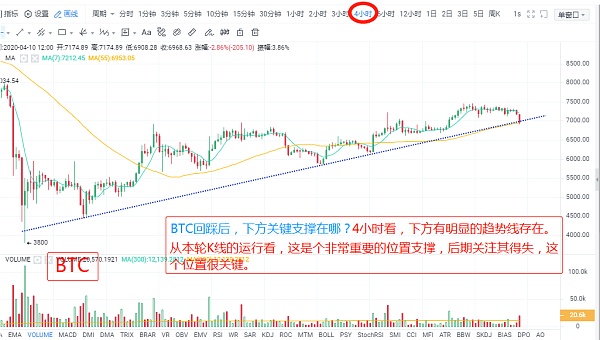 BTC回踩后,下方關鍵支撐在哪?4小時看,下方有明顯的趨勢線存在,從本輪K線的運行看,這是個非常重要的支撐,后期關注其得失。
