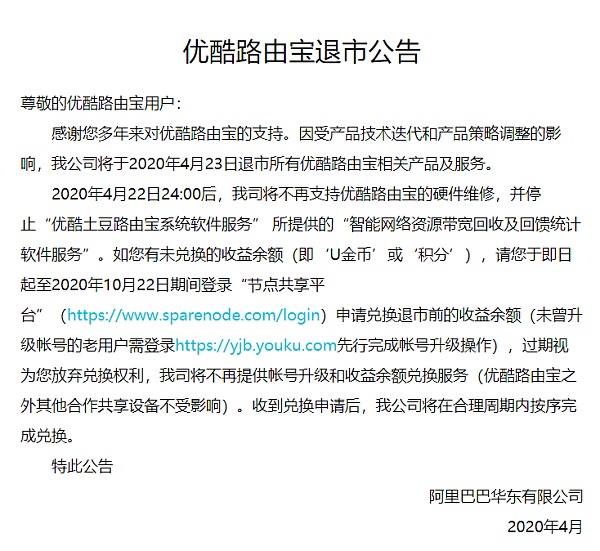 公告顯示,2020年4月22日24:00后,該公司將不再支持優酷路由寶的硬件維修,并停止“優酷土豆路由寶系統軟件服務” 所提供的“智能網絡資源帶寬回收及回饋統計軟件服務”。公告詳情如下: