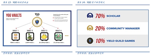 YGG GAMES的核心業務是投資游戲資產、租賃游戲裝備與培養游戲玩家。該 DAO 旨在通過投資區塊鏈游戲賺取游戲資產、培養游戲玩家、租賃游戲資產,以及打造增強元宇宙虛擬經濟的商業模式,推動創建全球最大的虛擬世界經濟體。YGG GAMES主動管理其社區擁有的資產,獲得最大效用,并與社區分享這些資產的利潤。YGG GAMES主要依靠投資、租賃、玩家培訓為一體的盈利模式。公會將投資的數字資產租賃給玩家,從而降低了游戲的進入門檻,同時有專門的經理負責玩家的培訓和社區的發展。公會為會員提供游戲裝備,會員在游戲中的收益按照7:2:1的比例分給會員、經理和社區。根據游戲公會于8月12日發布的社區公示,目前公會已有超過4000名打金學徒,他們絕大部分都來自菲律賓、印度尼西亞、巴西等發展中國家。這些學徒租賃游戲裝備參與游戲打金,在7月份游戲中產出了約合三百萬美元的游戲資產。