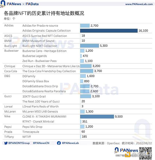 3)23個品牌NFT項目歷史累計持有地址總數達到了57307。與市場中熱門的原生NFT項目相比,品牌NFT的歷史持有地址數量并不少。這或許說明品牌NFT并沒有為NFT市場帶來新的圈外用戶,其規模并沒有顯著高于市場上的原生NFT項目,不過若與一般的原生NFT項目相比,這些品牌NFT更容易受圈內用戶歡迎。