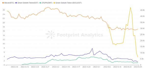 如此高的價格差讓在 BSC 上的 GST 充滿更多的泡沫,可以看到從 5 月 24 日后泡沫開始被戳破,兩個鏈的價格逐漸靠攏。在 Footprint Analytics 上看到 5 月 29 日,GST 在 Solana 上價格約 1.38 美元,在 BSC 上價格約 3.65 美元。