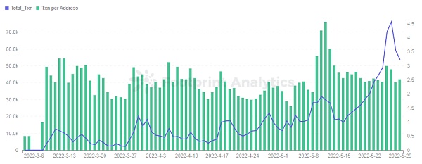 GMT 和 GST 的交易量也十分活躍,都在上萬筆以上。雖然總的交易量波動不大,但是從每個地址的平均交易次數能看出在 5 月中旬后明顯增多。