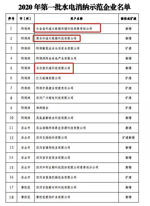 XRP/HKD-3.24%吳說區塊鏈獲悉,日前四川公布了首批“水電消納示范企業”,其中99家進入的企業中,有多個礦場在列,包括小金縣科迪大數據存儲科技有限責任公司、黑水科迪大數據科技有限公司、馬爾康科迪科技有限公司、康定智通互鏈科技有限公司、成都無極鏈科技有限公司康定分公司等。