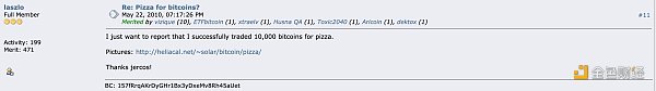 5月22日,Laszlo Hanyecz在論壇回復,有人給定了披薩,成功用10000枚比特幣買了2個披薩。