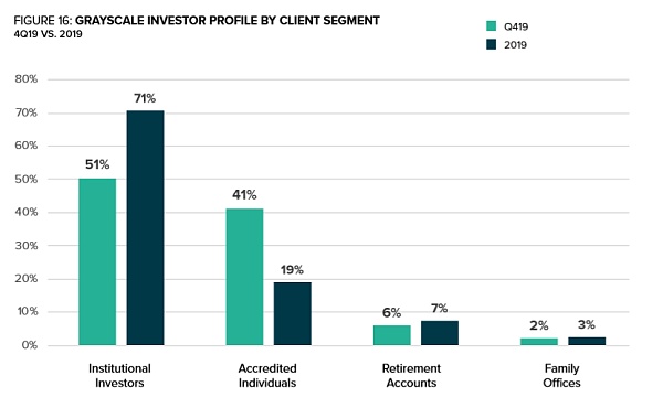此前,Grayscale董事總經理Michael Sonnenshein在瑞士舉行的Crypto Finance會議中表示,“他們來了,而且規模很大。2019年71%的資產來自機構,我們現在有經驗數據表明,這是更長期趨勢的一部分,我們沒有理由相信這種趨勢不會持續到2020年。”