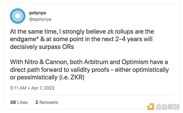 但我確實認為,我們應該降低一些期望。我們實際上預計 zkSync 將在今年年底全面推出 Alpha 版。在此之前,任何用戶都無法進行外部跨鏈。Arbitrum 的聯合創始人 Steven Goldfeder 分享了他對 zkSync 所描述的時間線的懷疑。