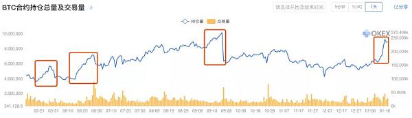 另外,從期貨合約持倉數據來看,近期總持倉量漲幅喜人,僅Okex平臺的BTC合約持倉總量,便超過了10億美金,CME比特幣期貨產品的未平倉合約價值2.37億美元,也將創下歷史新高。而每當期貨合約持倉量短時間內大幅飛漲過后,總會出現收割殘局,歷史會驚人的相似。