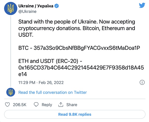 2月26日,烏克蘭官方賬號發布接受 Crypto 捐贈的請求。