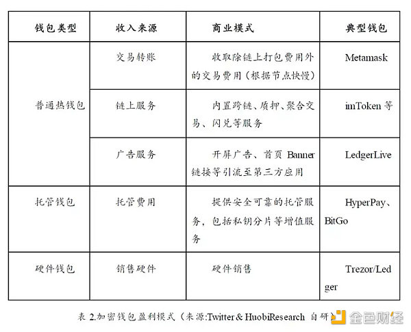 目前,市場中的加密錢包從普通熱錢包、托管錢包和硬件錢包來看,我們調研統計了市面上的大多數錢包,其收入來源和商業模式分析如下: