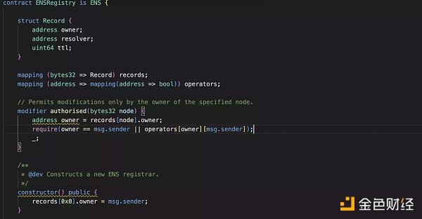 除了注冊表信息 records 維護,合約還維護 owner 的委托管理者信息 operators,owner 可以通過添加設置委托管理者地址(可以是用戶地址,也可以是合約地址)來共同管理域名信息 合約中相關管理設置接口(比如設置解析器,ttl,以及創建和修改子域名),都會通過修飾器`authorised(node)`來限制調用權限;該修飾器將判斷該接口的交易請求者是否為當前域名的 owner,或者委托管理者地址,保證了僅有域名的 owner 或委托者才有創建下一級子域名的權限。同時這里部署初始化的時候將`」」`根域名的 node 的 owner 設置為部署者,只有這樣,部署者才能將根域名的 owner 設置給 Root 合約根合約。