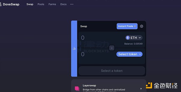 DoveSwap 是目前 Polygon zkEVM 上排名第二的 DEX,其交互流程也很簡單,選擇 ETH-USDC swap,隨后點擊 Pools,根據自己的資產情況添加流動性。