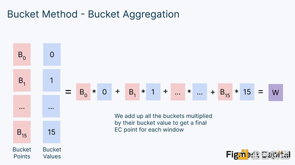 桶式積累:對于每個窗口,根據其系數,將每個 EC 點分類到一個桶中。然后將每個桶中的所有點相加,得到每個桶的最終值。