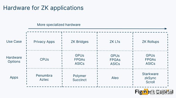 鑒于這些選擇,哪一個是最好的零知識證明成?這取決于應用程序。像 Penumbra 和 Aztec 這樣的隱私應用程序允許用戶在提交給網絡之前,通過創建其交易的 SNARK 來進行私人交易。由于所需的證明相對較小,只需使用他們的 CPU 就可以在他們的本地瀏覽器中生成。但對于真正需要硬件加速的較大的零知識證明,CPU 是不夠的。