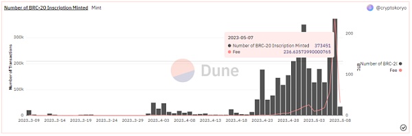 5月7日 BRC-20 銘文鑄造量超過373451,交易手續費高達236.64 BTC,平均單筆Gas高達約633聰。