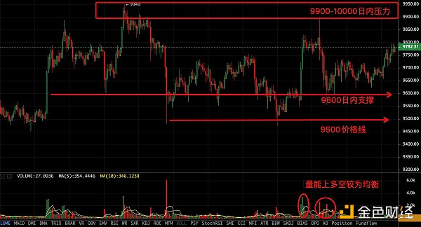 XRP/HKD-1.77%大盤近期偏整理走勢,震蕩區間變窄,由之前的9200-10000美金區間,轉為9500-10000美金區間內隨機震動。昨天下午4點短時放量拉升,從低點再次上攻沖擊1萬美金,隨后一個天地針再次回撤到9500美金底部。日內盤面支撐9500-9600美金區間,壓力9800-10000美金區間,量能沒有明顯的放大前,區間盤整的走勢延續。