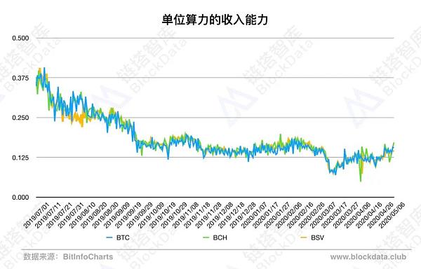 自3月12日暴跌之后,算力至3/20日到達低點也就是85E,而目前BCH或者是BSV上的算力依舊太少,從算力變化來看,替代并不明顯,所以鏈塔智庫對于減半完之后算力的變化預計在價格保持8000美元以上水平時,總算力應有80E左右。減少的算力應大多來自于淘汰老舊礦機。白皮書中的預言:交易手續費會變成礦工的收入核心。這一預言目前來看可能性較低,但存在進一步上升的空間,應該能彌補一部分區塊獎勵減半的損失。