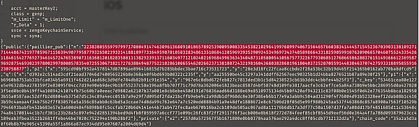 主密鑰②:主密鑰②是一個固定的密鑰,在內存中作為明文使用,以便參與雙方的簽名過程。由于雙方簽名算法的復雜性和獨特性,這個過程不能在TEE中完成。因此,一個有特權權限的攻擊者可以簡單地轉儲進程內存或劫持某些系統API來提取主密鑰②。下方截圖顯示了我們在iOS平臺上能夠提取到的主密鑰②。