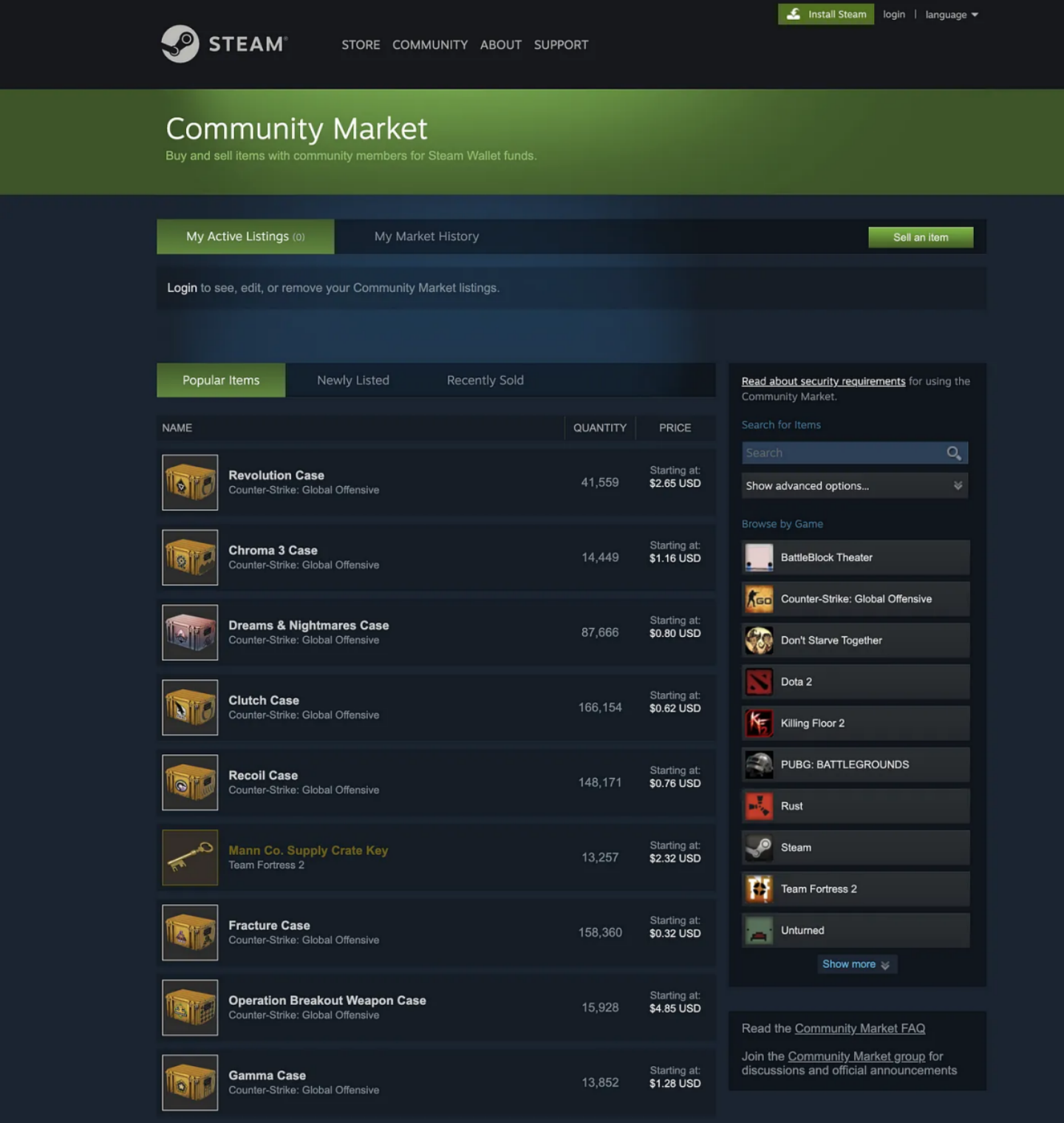 大多數游戲道具是無法交易的,但幸運的是,有一款著名游戲可以支撐我們進行這個實驗——CSGO (Counter-Strike: Global Offensive)。