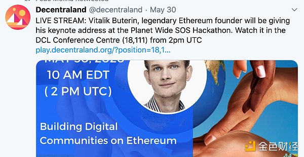 由于新冠疫情的影響,很多活動都轉移到了在線上。這些活動同樣可以組織在Decentraland上。比如Coinfest從3月30日到4月4日在Decentraland上的虛擬世界內舉行。V神Decentraland上的活動上Planet Wide SOS Hackathon發表了主題演講。
