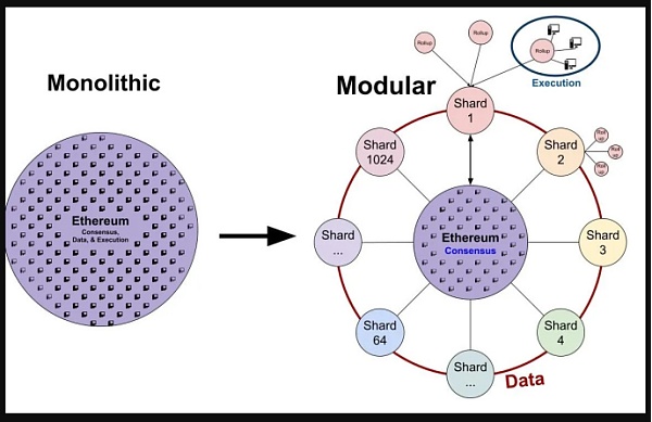 從區塊鏈層面出發,以太坊生命的初始階段是單一的(monolithic)。這意味著在最初的幾年里,Layer 1以太坊主網全權負責執行自己的交易,促進自己的網絡安全,并為自己的數據可用性提供服務。