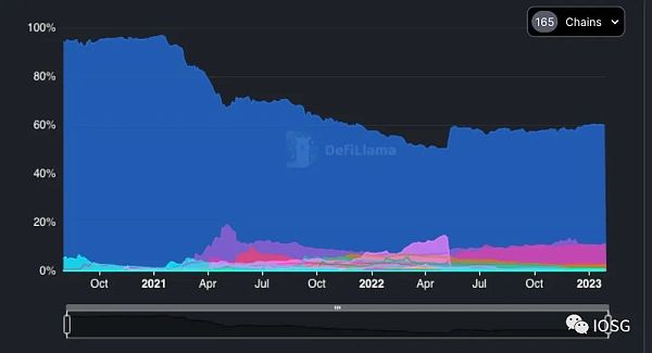 以太坊曾經擁有加密貨幣世界中除比特幣之外的所有流動性。在 2020 年底,以太坊 TVL 占比急劇下降到 60% 左右。以下是 165 個鏈的 TVL 數據。