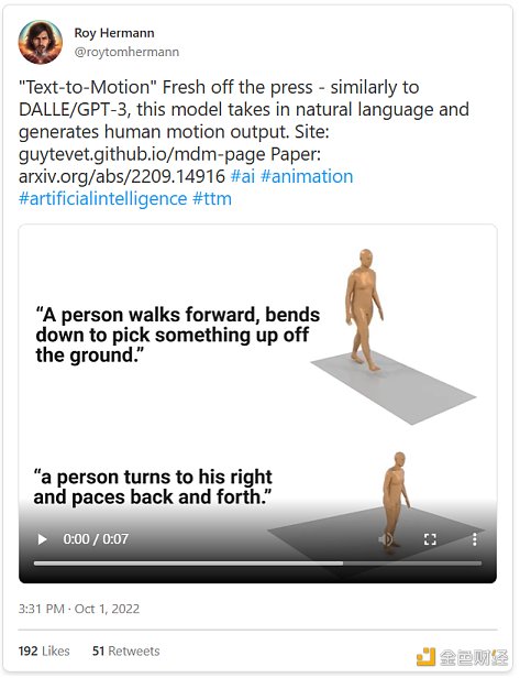 但是在實際問題之外,我認為另一個問題更有意思:文本到{文本、圖像、視頻等}的模型并不完美,但非常好用。在將想法以圖像或視頻的形式呈現出來這一方面,這些模型遠比普通人,甚至是本身頗有藝術造詣的人類要好得多。正如Daniel Herman關于ChatGPT提出的問題:對從事藝術、從事視頻制作而言,文本到一切意味著什么?我們是否會進入這樣一個時期:藝術的基礎知識變得更加商品化,任何人都可以通過不同的媒介,以更精細的藝術手法傳遞自己的思想?在那里,水彩畫的技巧被簡化為提示中的文字,剩下的就是人類和AI系統之間的共舞互動?