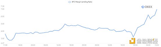 與此同時,季度期貨溢價快速,從60美元擴大到130美元以上。 此外,BTC 的現貨融資比率在衍生品多空比上升后也快速提高,從3.5升至7.0,表明現貨市場也通過借入USDT做多BTC。