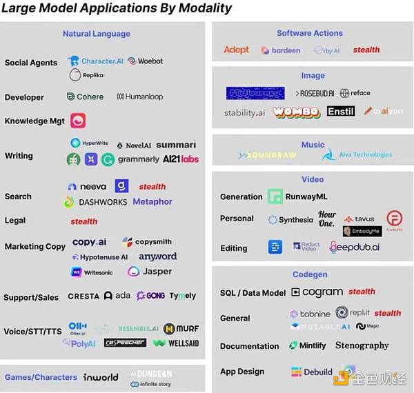 正如 AI 的 bitter lesson 一樣矛盾,投資者需要短期投資回報率、研究者需要短期投稿成功率,盡管OpenAI 走在通往 AGI 正確的路上,這條路道阻且長,短期很難看到極大的突破。而 Sam Altman 展望的大模型應用層公司很有可能有更高的高投資回報,讓我們來介紹下主要的分類與創業者。