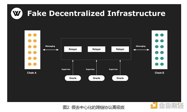 那如果放開Relayer,讓大家都可以來運行中繼器,是否能解決上述問題呢?圖2是將圖1的數量變多了。首先Decentralized并不是指運行者數量變多,誰都可以接入,那叫Permissionless。需求端一向都是Permissionless,讓供給端也Permissionless并不是劃時代的變革,這是市場端的變化,與產品本身的安全性沒有太強的關系。LayerZero的Relayer只是一個負責轉發信息的中介,本質與Oracle一樣,都是Trusted Third Party。試圖通過將受信主體從1個增加到30個來提高跨鏈安全性不過是徒勞無功,不僅沒有改變產品特性,還會有新的問題伴隨而生。