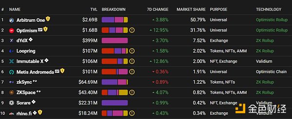 Optimistic Rollup:它的工作原理是在鏈下批處理交易,然后定期在鏈上發布結果,允許快速和廉價的交易,權衡安全性和去中心化水平,因為它總是假設交易是有效的(樂觀的)。此外,交易在被驗證之前會經歷 7 天的延遲。主要包括 Optimism ($17 億美元 TVL) 和 Arbitrum ($27 億美元 TVL)