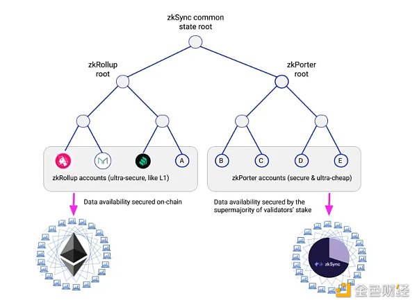 zkSync 開發了可以被視為主要創新的 ZKPorter,該功能將允許用戶和開發人員在 validity rollup(鏈上數據可用性)和 validium(鏈下數據可用性)之間進行選擇。這允許每個項目根據自己的需要選擇他們喜歡的格式,例如,與 DeFi 項目相比,游戲項目可能不需要具有相同的安全級別,并選擇 validium 而不是 validity。