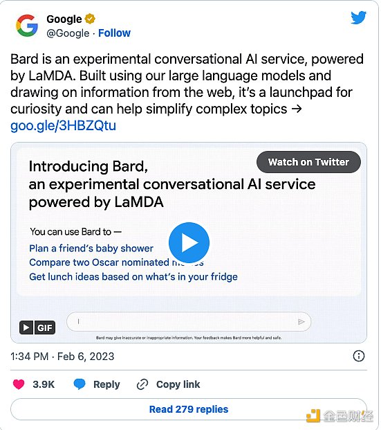 關注谷歌的科技愛好者們很快對Bard的信息整合能力提出了質疑。英國紐卡斯爾大學教授哈里森(ChrisHarrison)在推上寫道,“谷歌就不能在發布產品視頻之前檢查一遍嗎?”遭遇尷尬之后,谷歌隨后刪除了YouTube上的這段產品展示視頻,但推特上依然保留著。但Bard翻車的消息卻很快傳開,并且立即影響到了谷歌股價走勢。