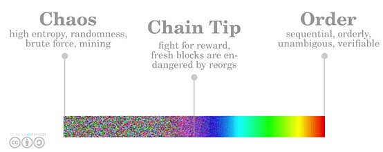 從某種意義上說,比特幣“生長”在有序和混沌之間:尋找新區塊是一個混沌的過程,其結果是一個非常有序的交易列表:比特幣區塊鏈,也稱為賬本。