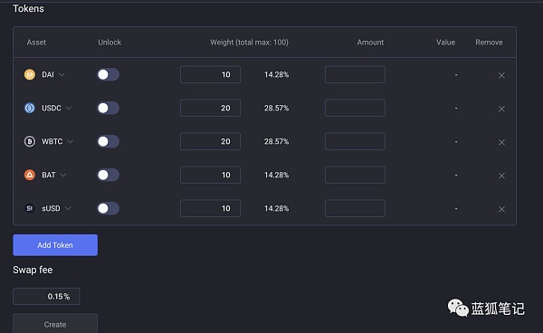Balancer的流動池可以有多種代幣,也可以只有兩種代幣。目前其流動性最好的是MKR-ETH流動池,截止到藍狐筆記寫稿時,其流動性達到3,189,561.03美元,24小時交易量為153,846.91美元,其池的比例不是Uniswap 常見的50%ETH和50%MKR,而是75%的MKR和25%的ETH。同時,在Uniswap上MKR-ETH的流動性為3,266,092美元,24小時交易量為176,995美元,就MKR-ETH的流動性池來說,當前兩者基本上處于同一水平。對于代幣的兌換者來說,用Balancer的MKR-ETH池進行代幣兌換更合適一些,因為其兌換費用為0.2%,但對于流動性提供者來說,其收入少了0.1%。Balancer上也有不少多個代幣的流動性池,最多有8個代幣的池。