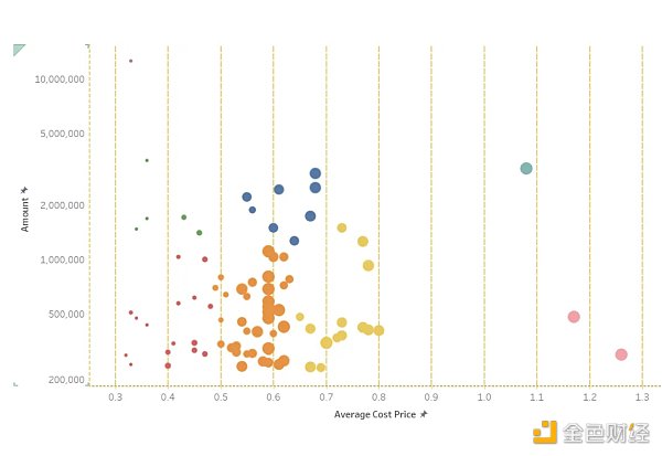 上圖是持幣大戶的成本,以及持有量的關系圖。球的大小代表著持有的時間。從上圖中我們可以直觀的看到
