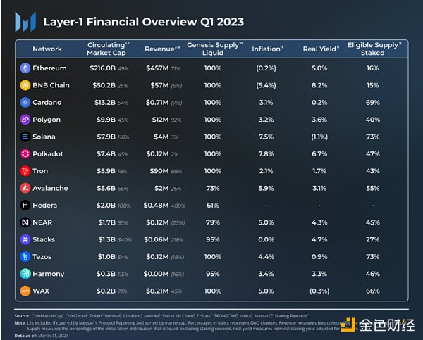 在經歷了2022年的動蕩之后,加密市場在今年第一季度呈現出了反彈趨勢。平均而言,我們研究的特定L1的市值季度環比漲幅為83%,但同比仍下跌了58%。STX在第一季度表現出色,主要是受到了比特幣Ordinals的流行趨勢的推動,這重新燃起了人們對比特幣可編程性的興趣。從絕對值來看,ETH的市值仍然超過其他網絡代幣總和的兩倍。