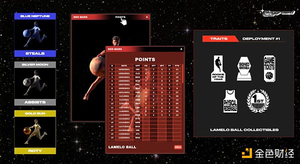在幻想體育競技領域,角色特征可根據球員在現實世界的表現(通過預言機檢索)進行升級/降級。例如,由 Chainlink 支持的拉梅洛·鮑爾 NFT。每場比賽結束后,NBA 球員的賽場數據會通過預言機上鏈,而球迷們則可以收集球員們的「天賦」作為代幣。拉梅洛 NFT 由四個不同類型屬性組成:紅色火星、藍色海王星、銀色月球以及金色太陽。它們與 NBA 球員的不同的統計數據息息相關。例如,紅色火星與得分相關,銀色月球與助攻相關。因此,每當拉梅洛得分或拿助攻時,也能提升對應 NFT 的價值。