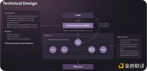 Vertex在協議層面上融合了一個完全在鏈上的交易場所和風險引擎,并且在頂部堆疊了一個鏈下序列器,從而形成了一個混合訂單簿-AMM DEX。鏈上交易和風險引擎包含著Vertex的核心產品,即現貨市場,永續市場和貨幣市場,并由Arbitrum層的Vertex協議智能合約控制著。