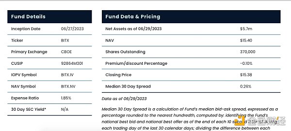 根據Odaily星球日報監測,上線首日發行了 11 萬股,發行價 15 美元,資產凈值 165 萬美元,首日交易額達 550 萬美元,是今年發行的加密 ETF 首日成交量最好的。(Odaily 注:南方東英 BTC 期貨 ETF 首日交易額僅為 83 萬美元,三星比特幣 ETF 僅為 9.8 萬美元)。