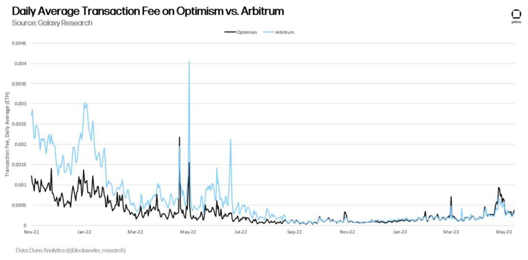 截至 2023 年 6 月 13 日,在兩個最受歡迎的以太坊 rollup 上發送交易的成本,Optimism 和 Arbitrum,趨勢是 0.03 美元至 0.05 美元左右。然而,在鏈上活動頻繁和網絡擁堵的情況下,這些成本有時會飆升到 1 美元以上。
