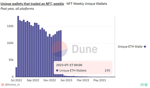 根據Dune的數據,在過去七天內,只有190個獨立的ETH錢包購買或出售了NFT。相比之下,將近一年前,有超過181000個獨立的ETH錢包做了同樣的事情。