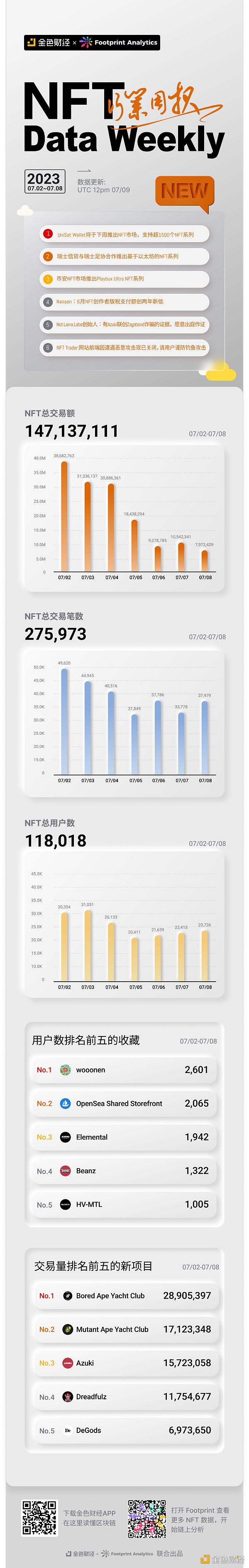 5、交易量排名前五的新項目:Bored Ape Yacht Club、Mutant Ape Yacht Club、Azuki、Dreadfulz、DeGods