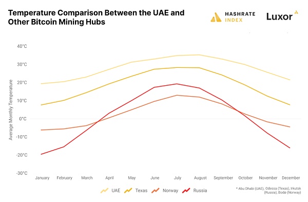 與上面的圖表顯示的情況相比,德克薩斯西部作為比特幣挖掘中心的月均氣溫在 14°C 至 35°C 之間,明顯比阿聯酋要涼爽。有趣的是,即使在德克薩斯西部,由于炎熱天氣的原因,礦工們在夏季期間也會定期減少挖掘活動。