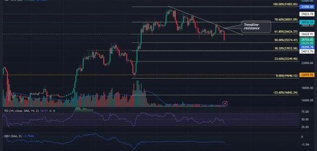 61.8%斐波那契水平($26.6k)的黃金口袋是自3月底以來的關鍵支撐。它已經過多次重新測試,但最終在Binance訴訟后于周一破解。