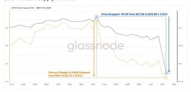 根據Glassnode,BTC從27,000美元急劇下跌至25,000美元,供應量占利潤的百分比從69%下降至約62.5%。值得注意的是,巨大的利潤供應量使BTC不可能超過28,000美元,因為該水平是一個明顯的利潤目標。