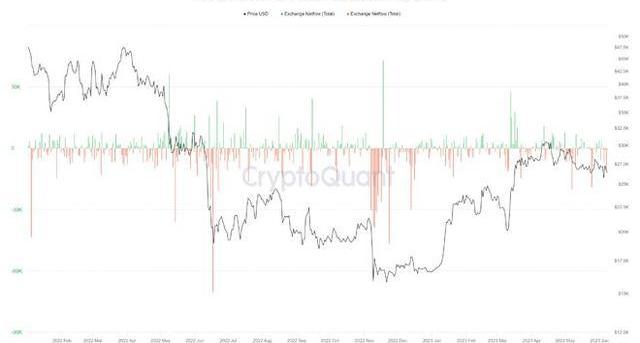 具體來說,檢查比特幣的凈流量指標,它在6月7日飆升至超過-10,000。它代表了當月記錄的最高流量。截至撰寫本文時,Netflow仍處于負值,超過1,000。