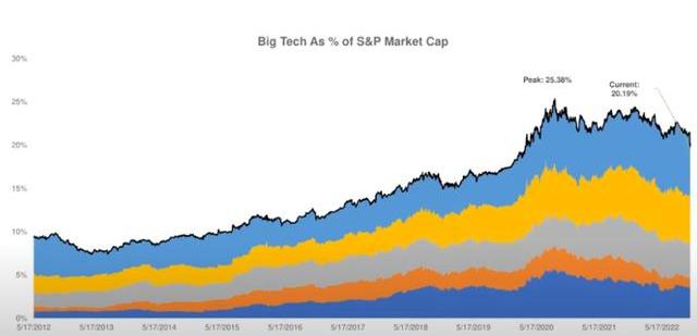 “這張圖表令人難以置信的是,當每個人都在談論做多標準普爾500指數時,它實際上總是代表做多亞馬遜、Facebook、谷歌和蘋果。在今年5月的高峰期,標準普爾500指數中每一美元中0.25美元是這五家公司。
