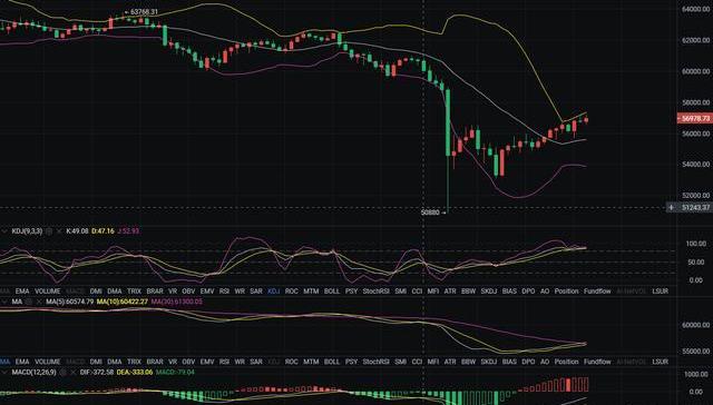 目前的行情走勢來說,價格昨日暴跌萬點價格最低觸及50880位置,日內早間價格走出反彈現在最高觸57200附近位置,反彈的力度還是比較可以的。小時圖來,行情凌晨受阻后一根大陰柱幣價從BOLL上軌拉下中軌,隨后小幅震蕩上行,目前已經上行至布林通道中上軌,布林通道開口向上,MACD快慢線在零軸上方形成金叉,能量柱呈多頭縮量。4小時圖上看,價格昨日下行之后日內價格走出反彈,目前短線表現出震蕩調整需求,5日均線目前于55300附近盤整。日內策略來說還是建議高空為主。