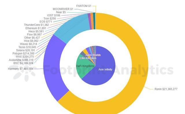 GameFi日交易額表現最佳的3條鏈則分別是Ronin、Harmony、BSC,交易額由AxieInfinity、DeFiKingdoms、TinyWorld、Mobox等貢獻。