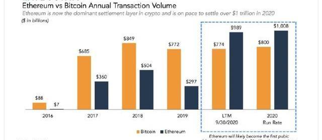 相比較比特幣,在2020年,以太坊的價格縱然未能創造歷史新高,但在生態層面卻并不遜色。2020年ETH的每日交易規模已經超過了比特幣,在金融結算方面開始表現出眾。從這個角度來講,ETH不僅捕獲了整個網絡結算層的價值以支撐DeFi應用的大規模發展,同時還具備了類似于BTC的價值儲存功能,并不斷取得越來越多的共識。